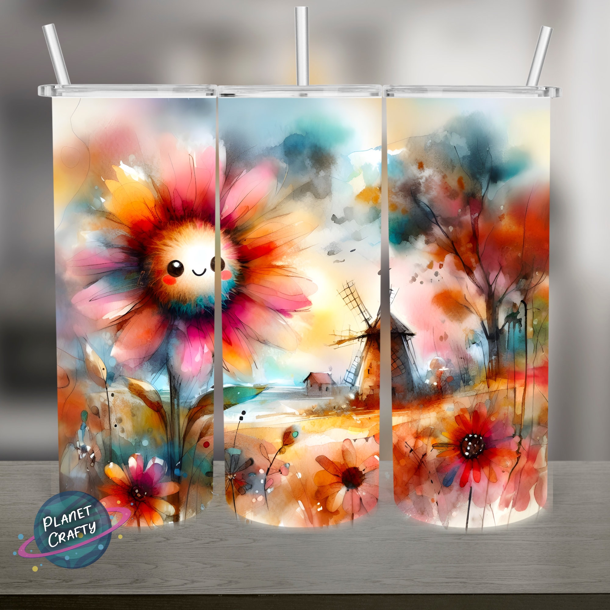 Happy Flower Watercolor PNG Design, 20Oz Skinny Tumbler Wrap, Digital Download