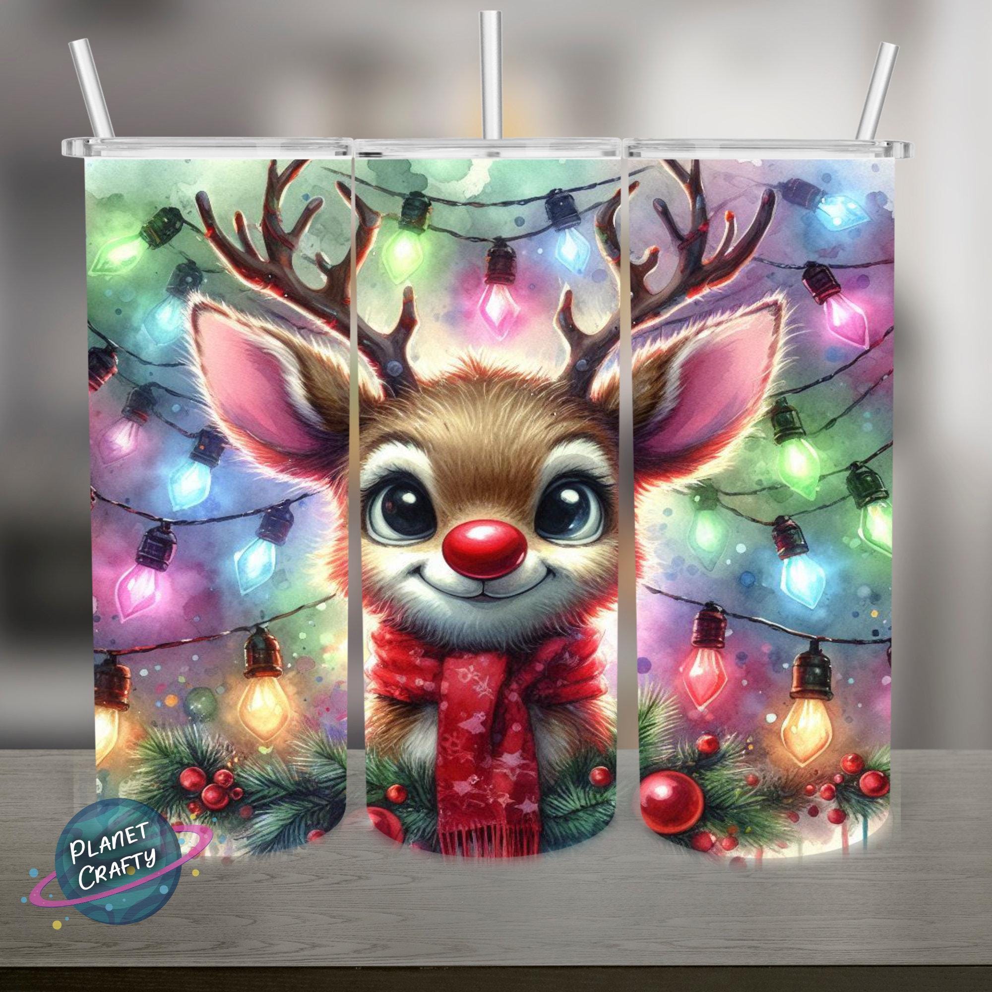 Rudolph Red Nosed Reindeer Among Christmas Lights PNG Design, 20Oz Skinny Tumbler Wrap, Digital Download