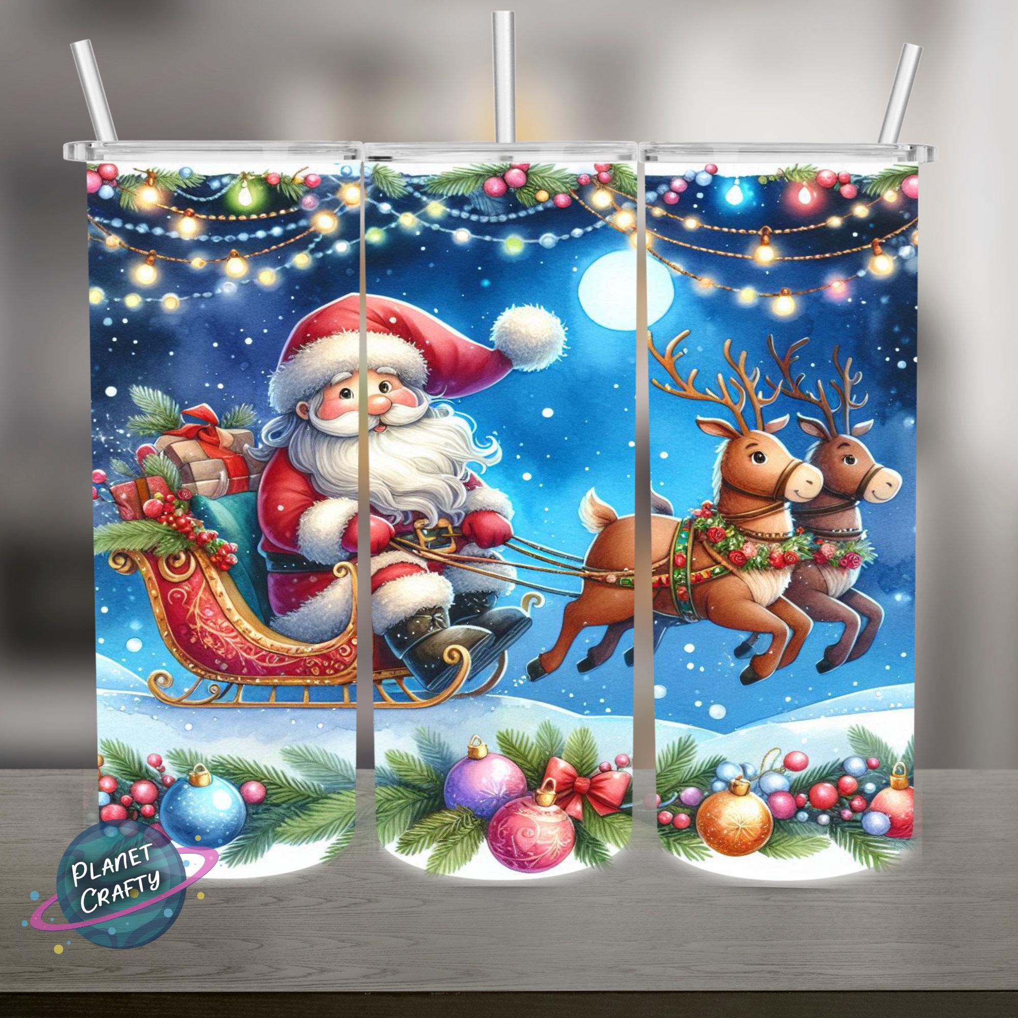 Santa, Sleigh and Reindeer, Christmas PNG Design, 20Oz Skinny Tumbler Wrap, Digital Download